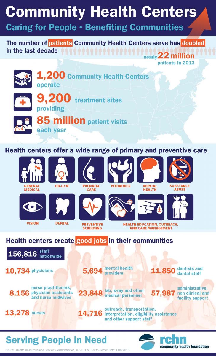 An infographic showing the scope of Community Health Centers (2013 UDS data on health center scope services and jobs).